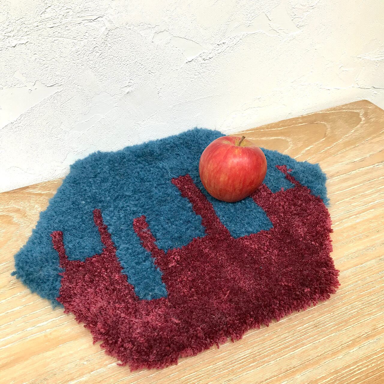 ワインレッドとターコイズブルーの組み合わせが、童話にでてくるあのりんごを彷彿とさせる六角形のラグ。