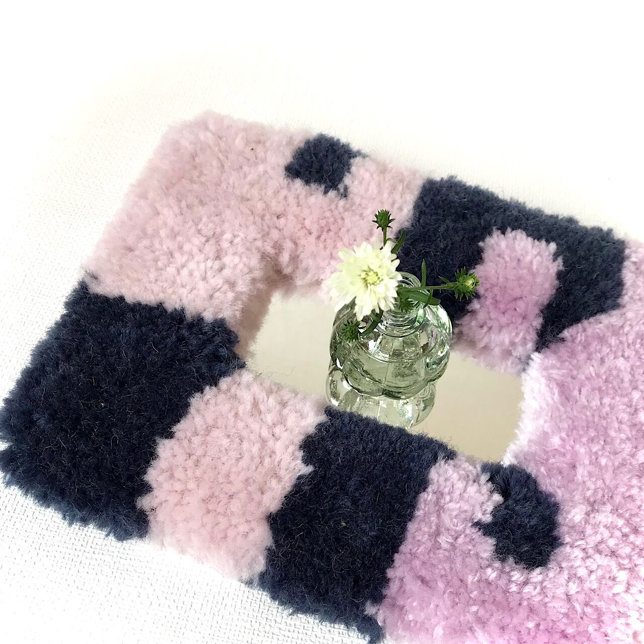 毛糸のあたたかみを感じられる、タフティングでフレームを制作したミラー。