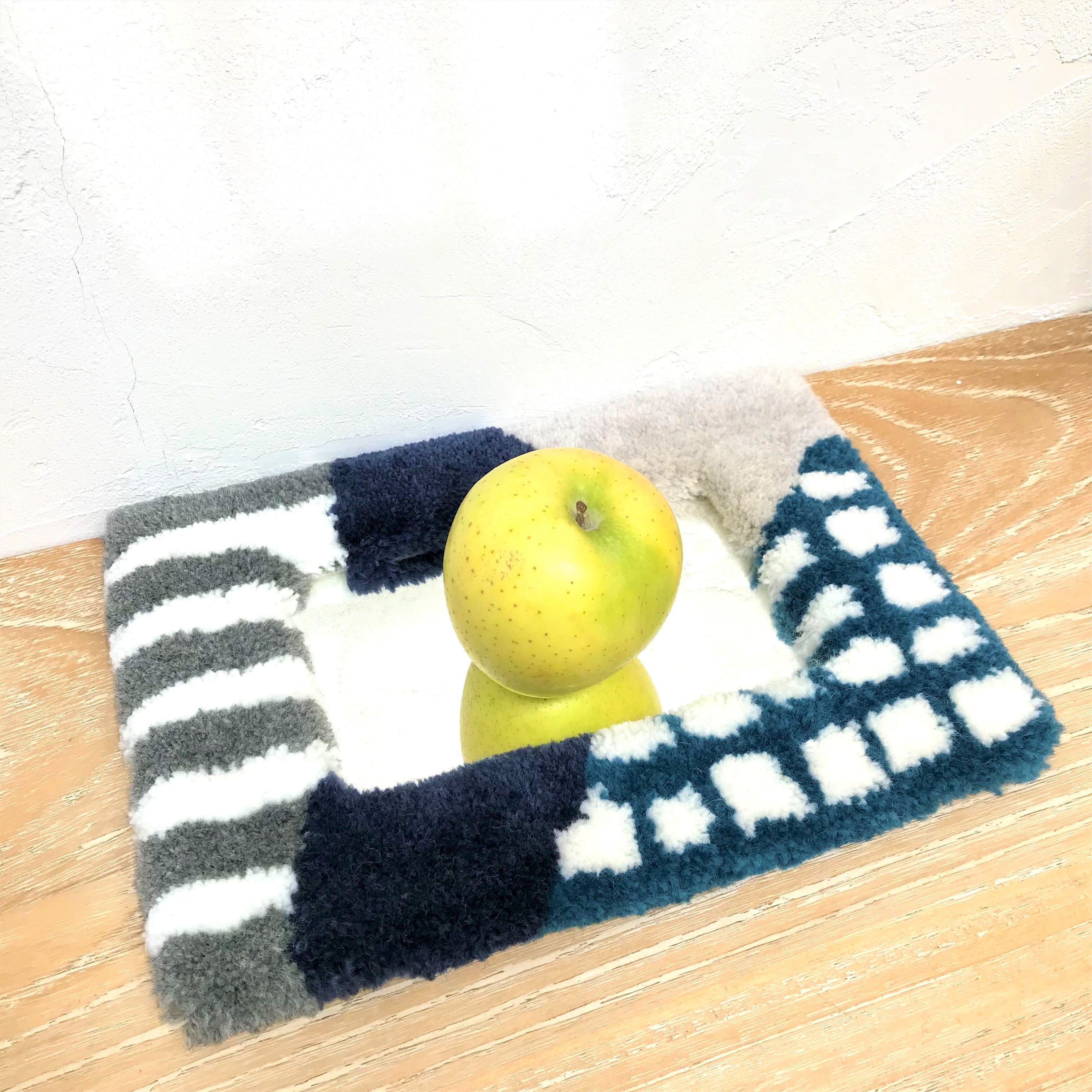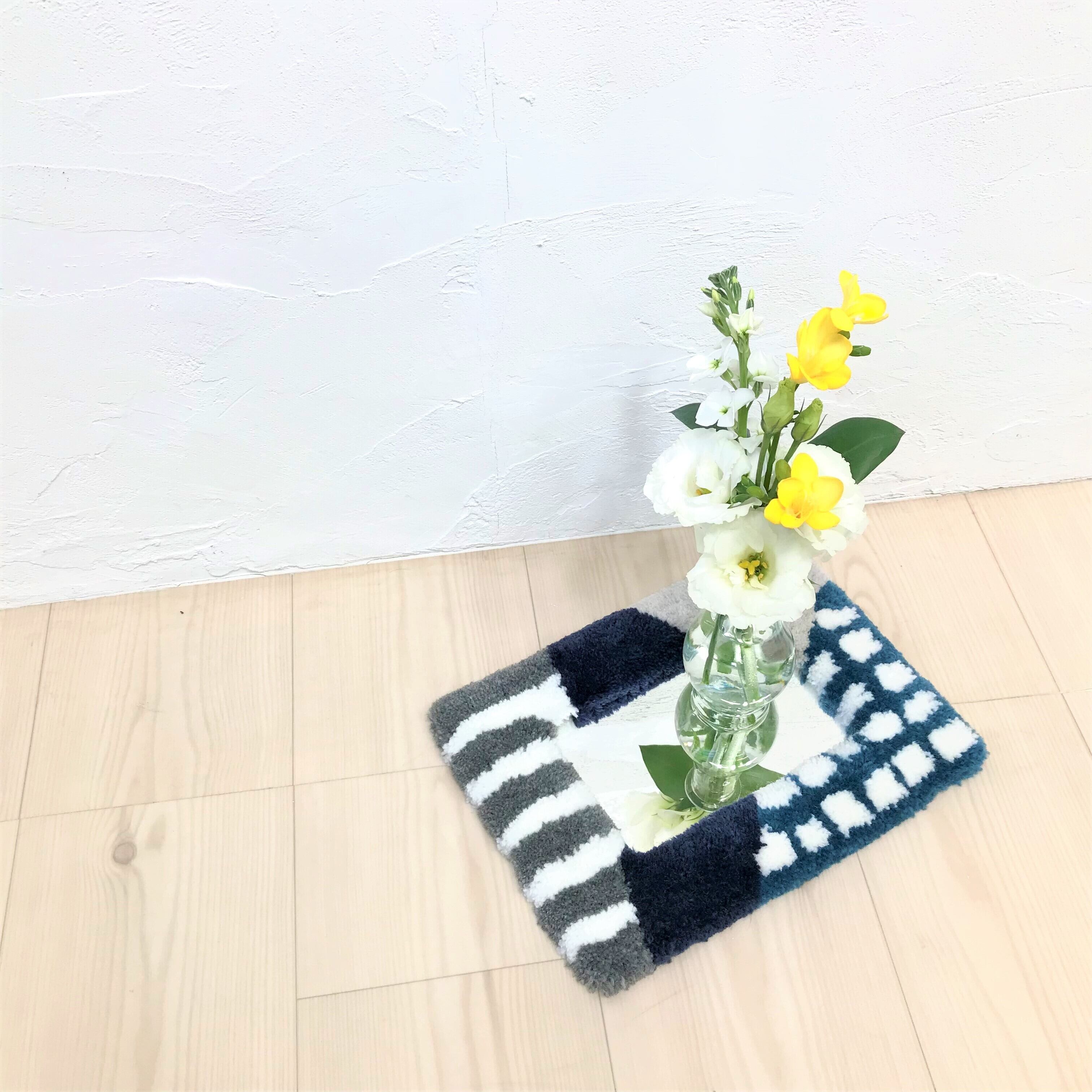 タフティングガンでキャンバスに絵を描くように一針一針毛糸を打ち込んでいく、tufting《タフティング》という技法で製作しています。